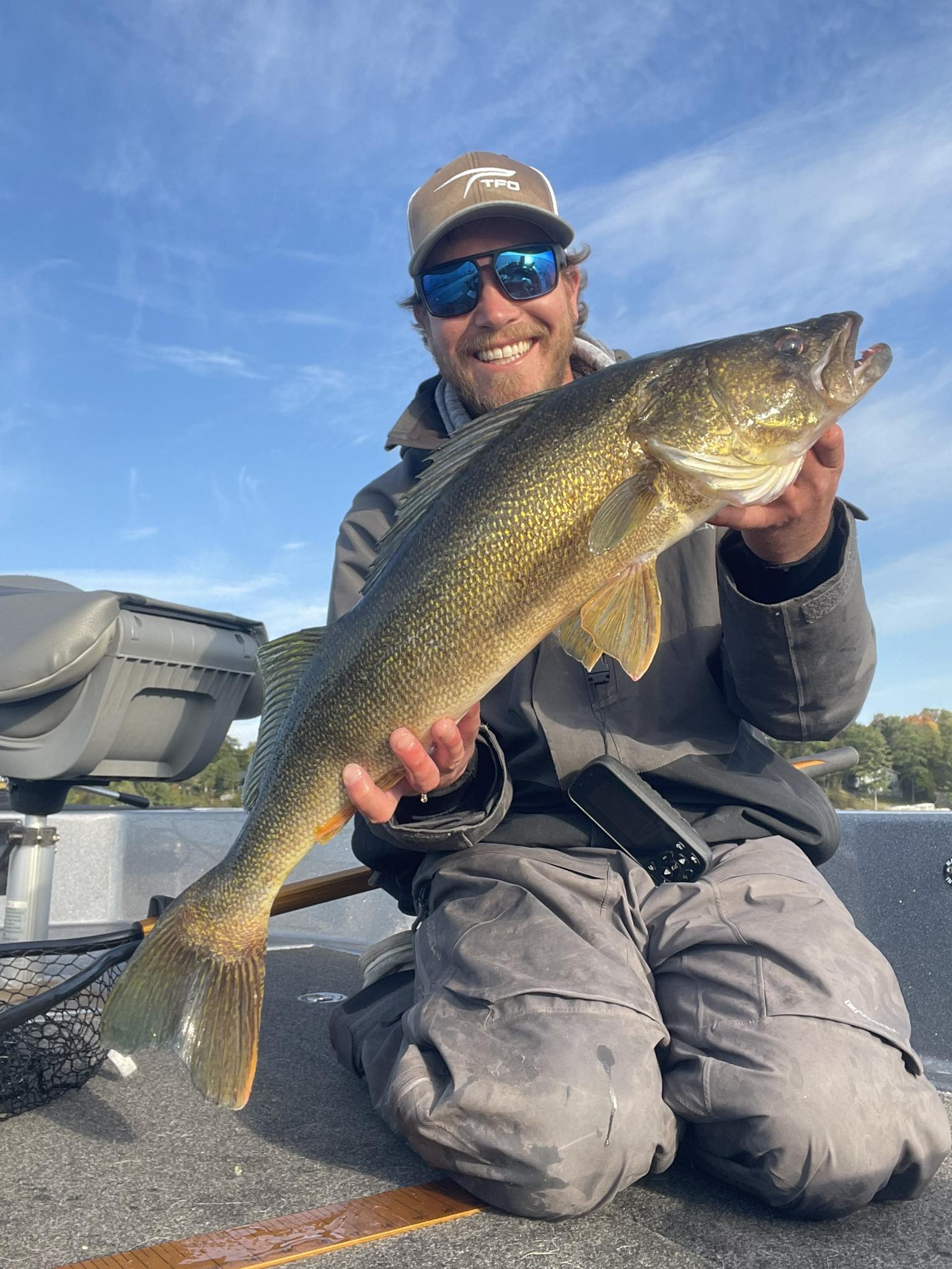 An angler holding a large golden walleye on a boat under clear blue skies during a crisp fall morning.
